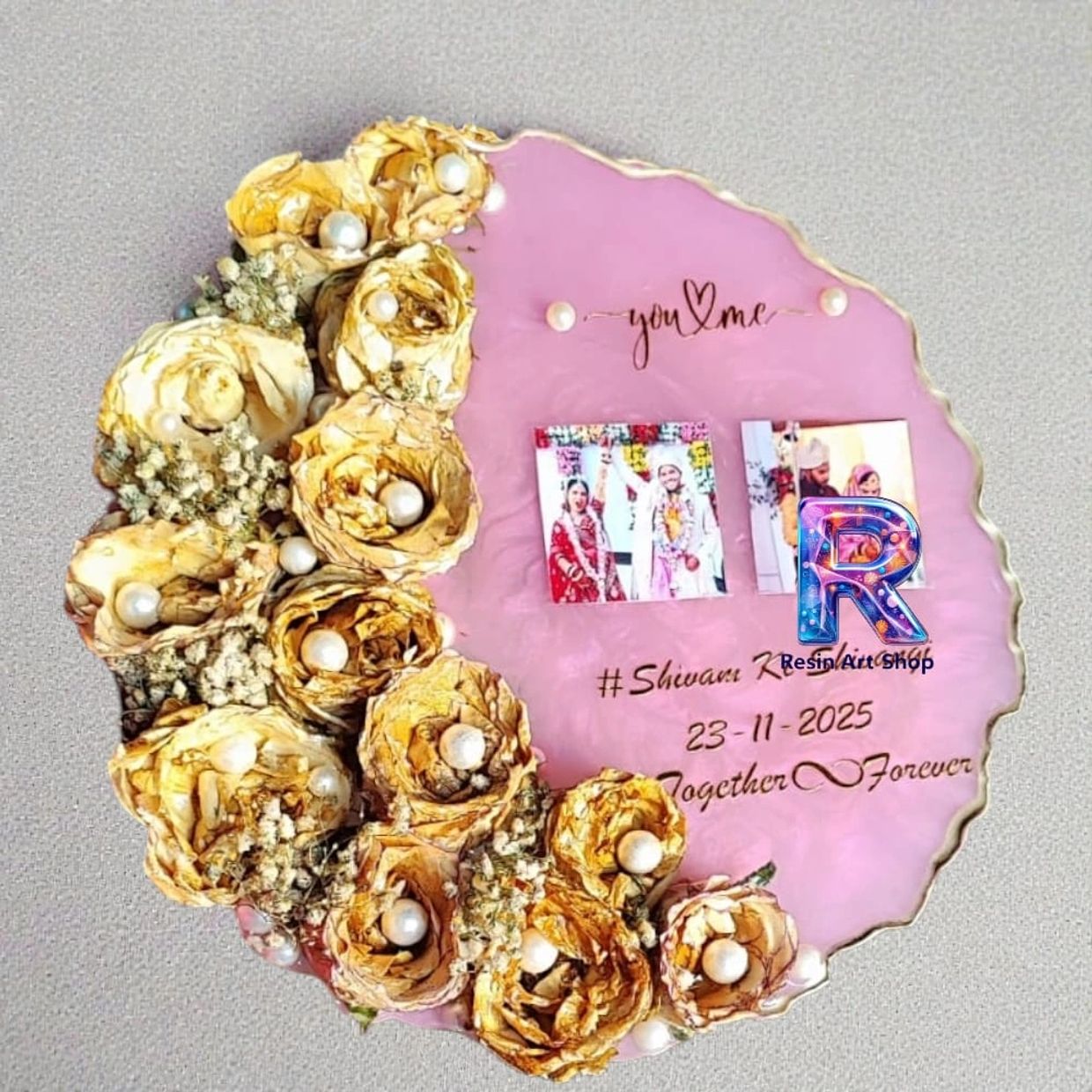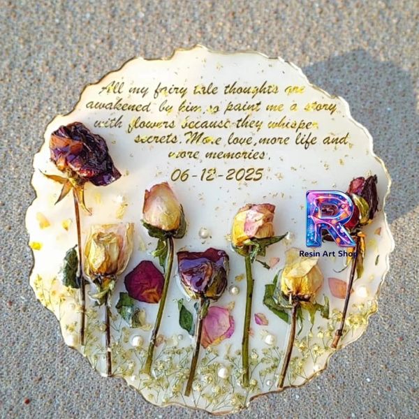 Bouquet Preservation in a agate style with golden text of names and dates. Even get your special flower gifted by someone speical. Get them preserve for long lasting memories and unique idea of gifting.