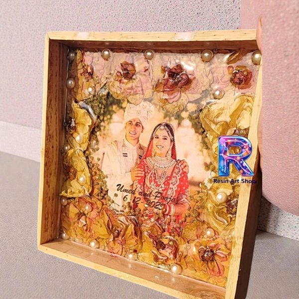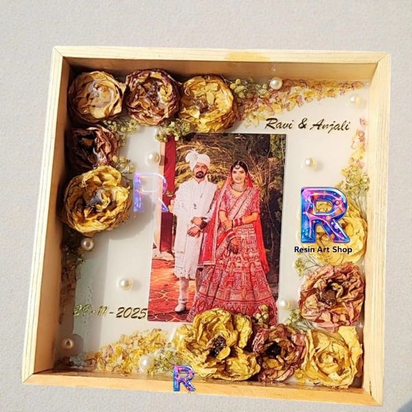 Get your Varmala Flowers preserved in Square Teakwood or Pinewood wooden frame. Your flowers get preserved in high quality epoxy resin. Add your favorite photo and your mala moti and kaleera or even wedding card.