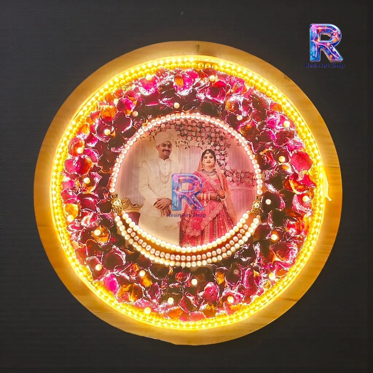 Varmala Preservation Preservation in a circlular wooden frame style added with LED all over with golden text of names and dates. Even get your special flower gifted by someone speical. Get them preserve for long lasting memories and unique idea of gifting.